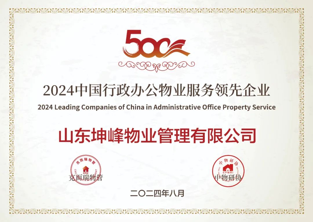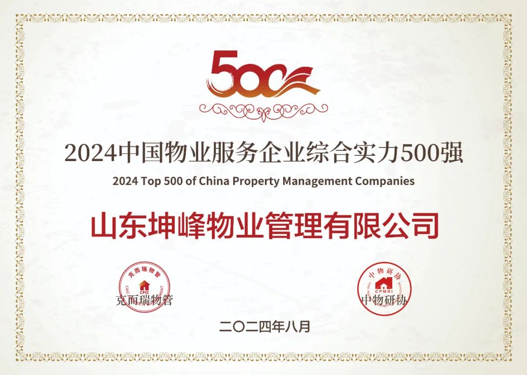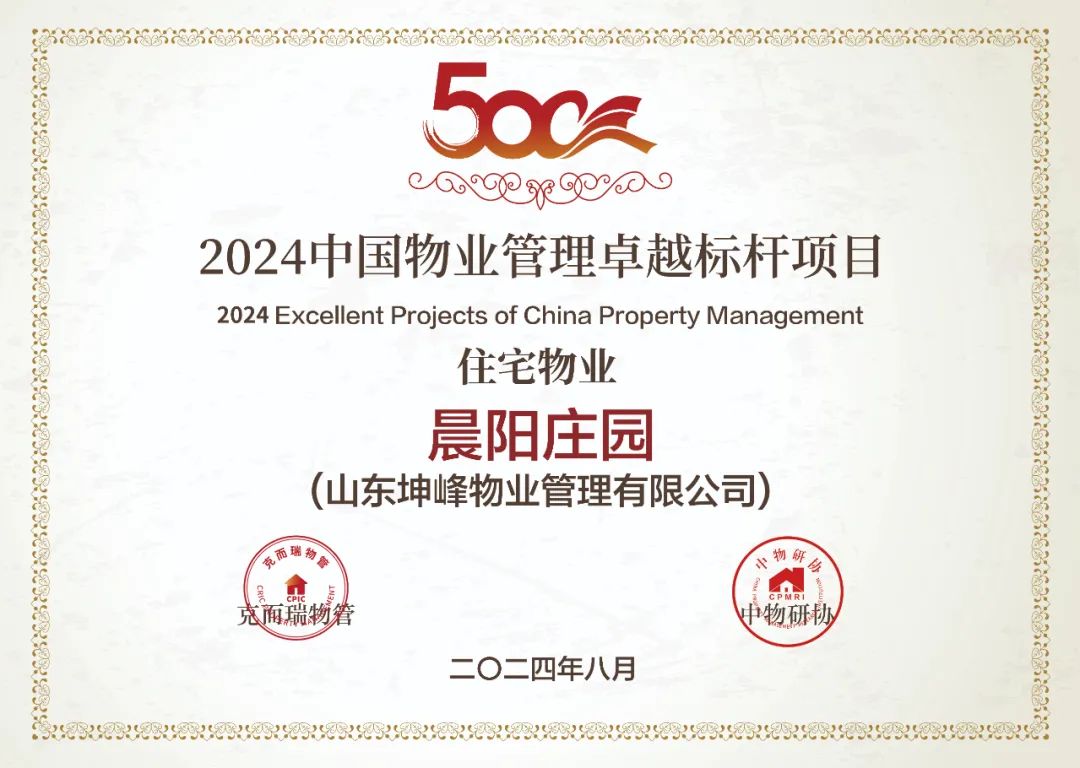 在「2024中國物業(yè)服務(wù)企業(yè)綜合實(shí)力研究成果」中,山東坤峰物業(yè)管理有限公司榮獲“2024中國物業(yè)服務(wù)企業(yè)綜合實(shí)力500強(qiáng)”“2024中國行政辦公物業(yè)服務(wù)領(lǐng)先企業(yè)”以及“2024中國物業(yè)管理卓越標(biāo)桿項(xiàng)目——晨陽莊園(住宅)”獎(jiǎng)項(xiàng)。